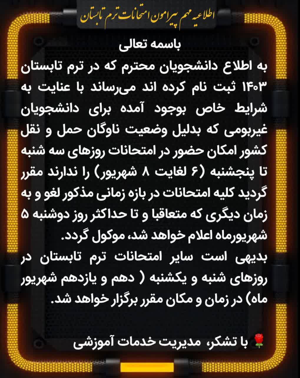 لغو کلیه امتحانات ترم تابستان در بازه زمانی ۶ تا ۸ شهریور اعم از دانشجویان بومی و غیربومی