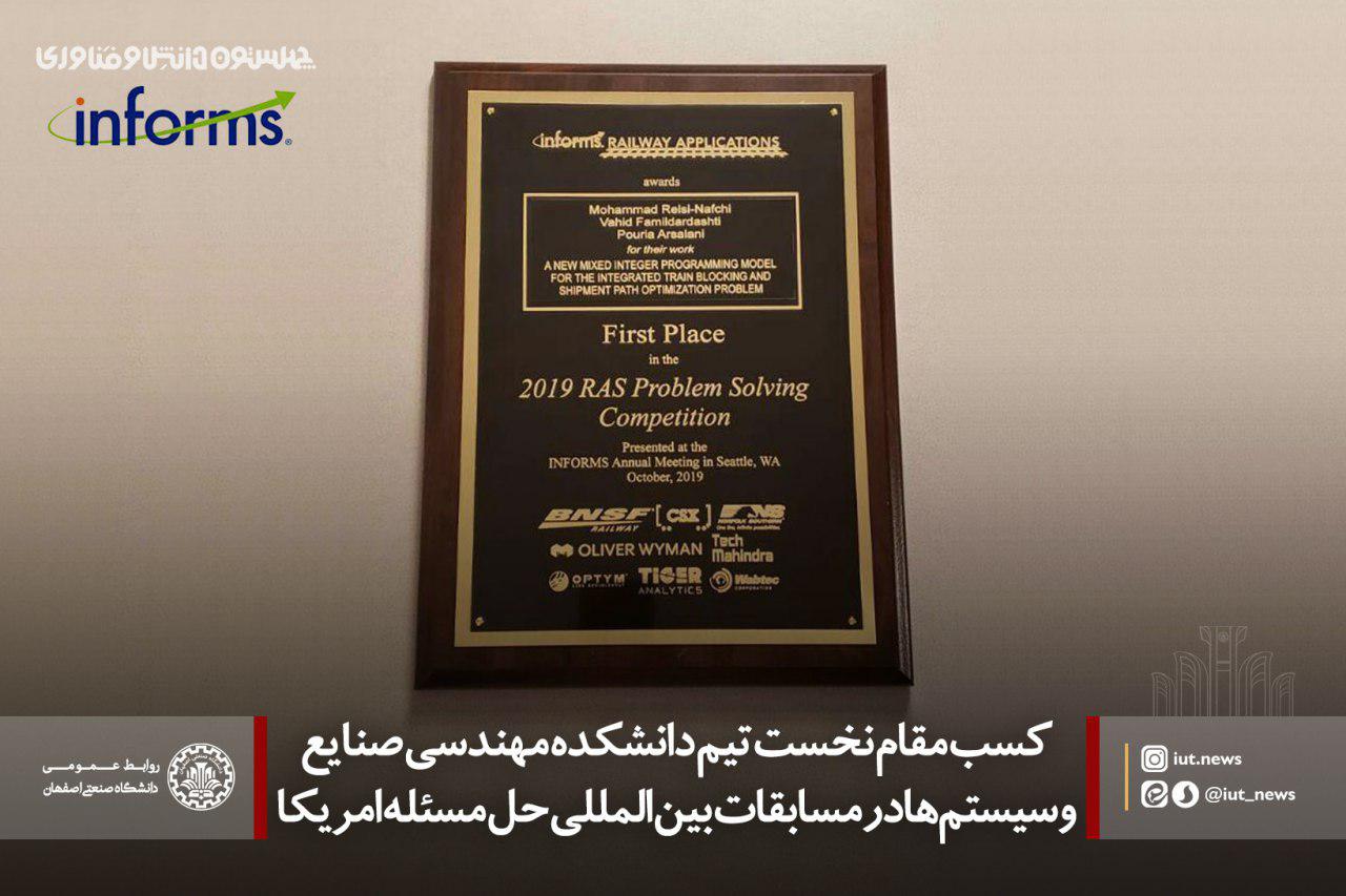 گفتنی است: مسابقات بین‌المللی حل مسئله در حوزه حمل و نقل ریلی (RAS 2019 INFORMS) از سال 2010 و به صورت سالیانه برگزار می‌ شود و این برای اولین بار است که یک تیم از دانشگاه‌های ایران موفق به کسب چنین مقامی در مسابقات با این سطح می‌شود.