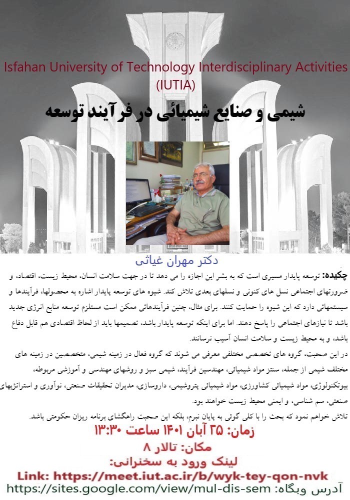 ششمين سخنرانی از سلسله سخنرانی‌های بین‌رشته‌ای دانشگاه صنعتی اصفهان با موضوع بررسی «شيمي و صنايع شيميايي در فرايند توسعه » با ارايه دكتر مهران غياثي استاد برجسته دانشكده شيمي دانشگاه صنعتي اصفهان روز 25 آبان ماه در تالار 8 دانشگاه صنعتي اصفهان و همچنين به صورت برخط برگزار می‌شود.