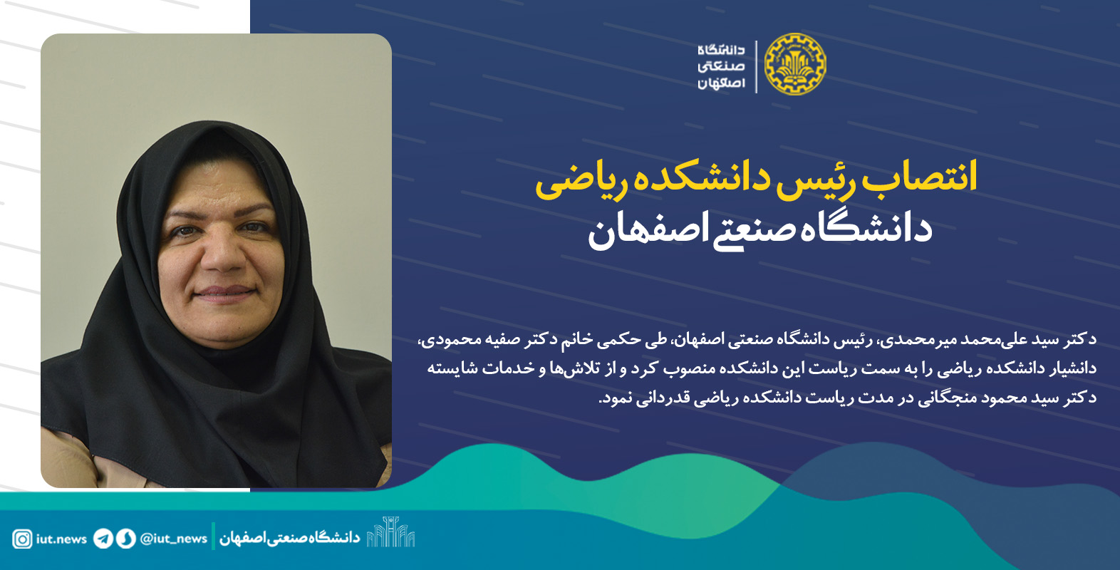 دکتر سید علی محمد میرمحمدی ، رئیس دانشگاه صنعتی اصفهان، طی حکمی خانم دکتر صفیه محمودی، استاد دانشکده ریاضی را به سمت ریاست این دانشکده منصوب کرد و از تلاش ها و خدمات شایسته دکتر سید محمود منجگانی در مدت ریاست دانشکده ریاضی قدردانی نمود.