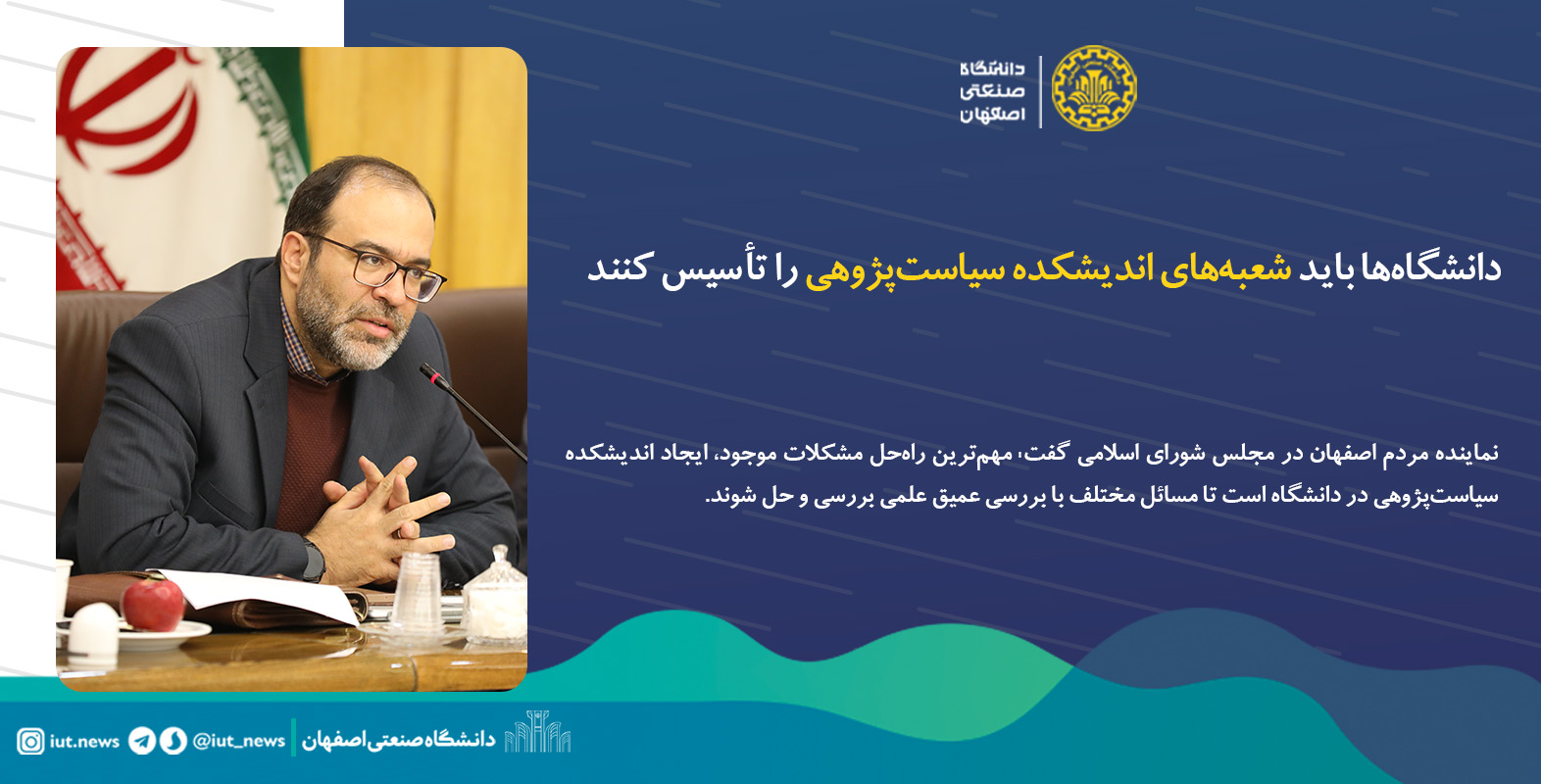 نماینده مردم اصفهان در مجلس شورای اسلامی در نشست شورای دانشگاه صنعتی اصفهان روز یکشنبه 13 اسفندماه گفت: مهم‌ترین راه‌حل مشکلات موجود، ایجاد اندیشکده سیاست‌پژوهی در دانشگاه است تا مسائل مختلف با بررسی عمیق علمی بررسی و حل شوند.